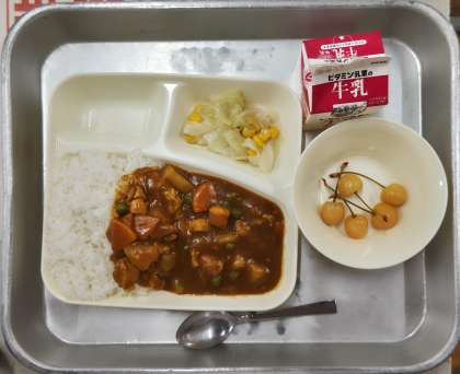 本日の給食は、牛乳、チキンカレーライス、キャベツとコーンのサラダ、さくらんぼ でした。