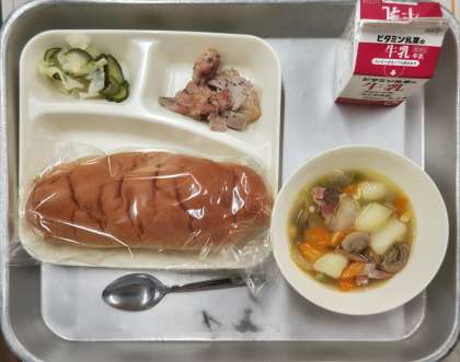 本日の給食は、牛乳、パン、鶏肉のバジル焼き、ベーコンと野菜のスープ煮、キャベツときゅうりのサラダ でした。