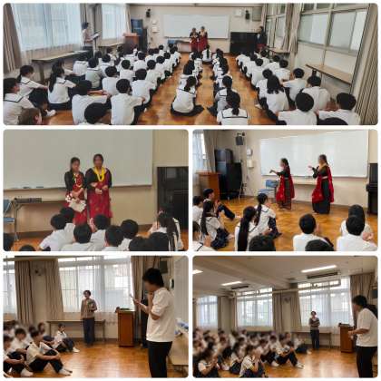 3年生にはネパールや中国、イギリスなど、外国の国籍の生徒が増えてきました。そこで、異なる国や文化を知って、それに対する理解を深めようという取組みを行いました。民族衣装を着て踊りを披露してもらったり、飛び入りで自国のことを話してくれる生徒が出るなど、大盛り上がりでした。