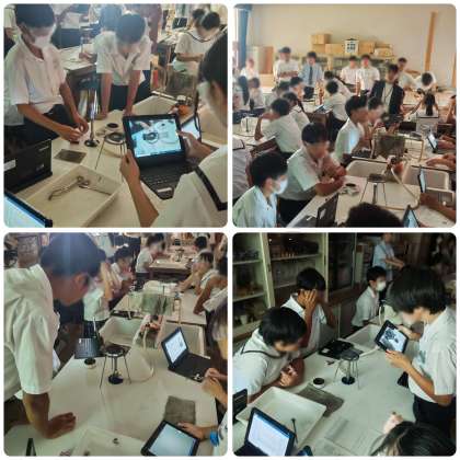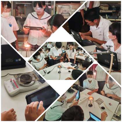 ガスバーナーでマグネシウムを加熱すると激しく燃え、その様子をタブレットで画像に収めて実験結果のレポートに使用しました。