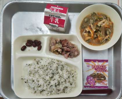 本日の給食は、菜飯、牛乳、豚肉の甘辛焼き、とうがんのみそ汁、金時豆の煮もの、いもけんぴフィッシュ でした。