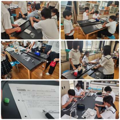 一定の力で傾斜で台車を走らせたときの速度について実験を行いました。記録タイマーの点の間隔を計り速度が速くなっていることを確認、なぜそうなるのか、力の向きから考えました。