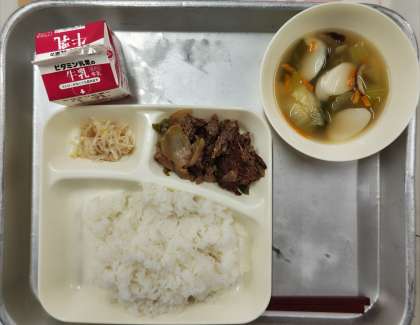本日の給食は、ごはん、牛乳、プルコギ、トックスープ、もやしのナムルでした。