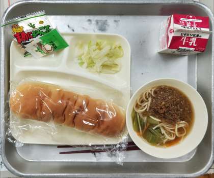 本日の給食は、コッペパン、牛乳、タンタンめん(肉みそ)、タンタンめん(汁めん)、あっさりキャベツ、豆こんぶ でした。