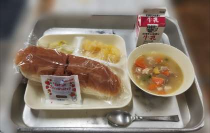 本日の給食は、コッペパン、牛乳、イチゴジャム、鶏肉とさつまいものシチュー、はくさいのピクルス、パインアップル(カット缶)でした。
