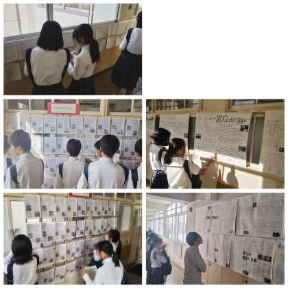 各学年のフロアの展示作品たち。1年生の平和新聞や、2年生の職場体験新聞、3年生の修学旅行新聞、とこれまでに取り組んだ行事や学習を内容とした展示が並んでいます。