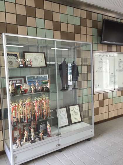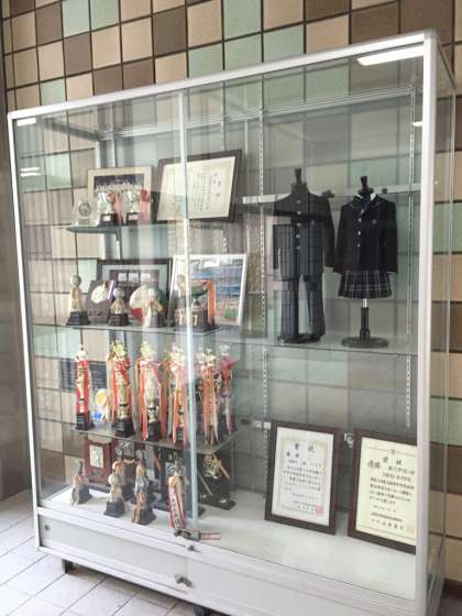 来年度からの新制服のミニボディが、玄関ガラスケースに飾られています。