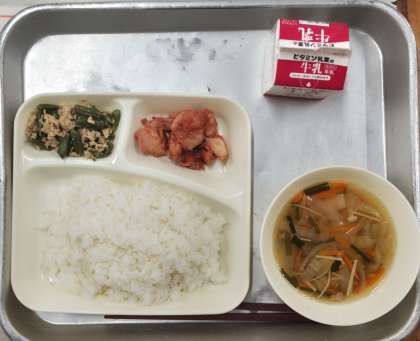 本日の給食は、ごはん、牛乳、鶏肉のチリソース焼き、焼き豚のスープ、ツナとさんどまめのオイスターソースいためでした。