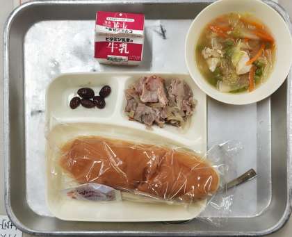 本日の給食は、パン、牛乳、豚肉のバジル焼き、スープ、うずら豆のグラッセでした。