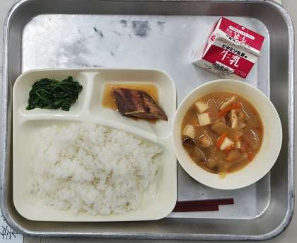 本日の給食は、ごはん、牛乳、なまぶしのしょうが煮、なめこのみそ汁、ほうれん草のごまあえでした。