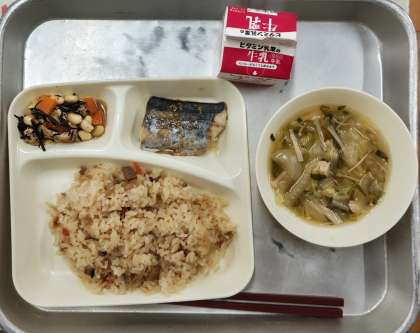 本日の給食は、かやくごはん、牛乳、さごしのごまじょうゆかけ、すまし汁、大豆の煮ものでした。