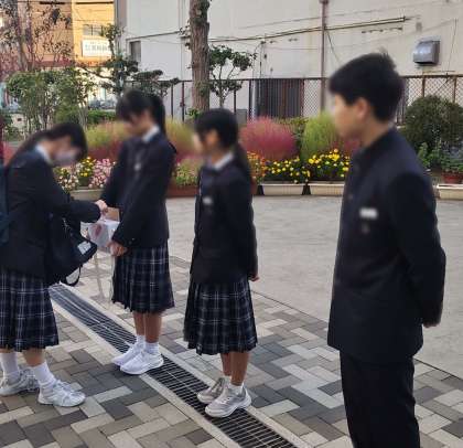 今週、生徒会役員を中心に、毎朝のあいさつ運動をしながら赤い羽根共同募金を行っています。初日からたくさんの生徒が募金に協力してくれています。