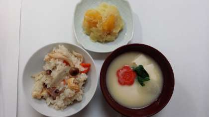 家庭科部の調理実習、炊き込みご飯と、お雑煮、栗きんとんができあがりました。