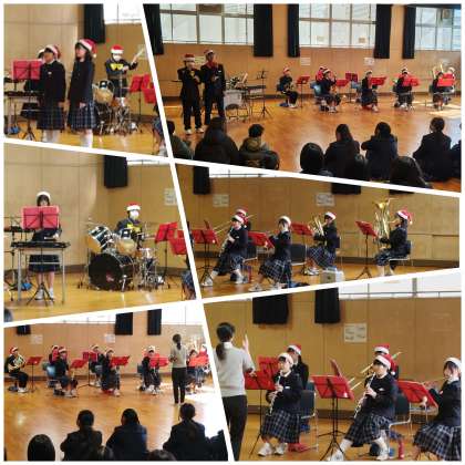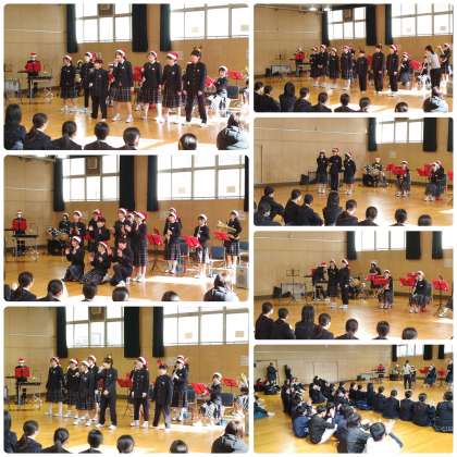 終業式後、吹奏楽部でクリスマスコンサートを行いました。「ピースサイン」「ずっこけ男道」「Pretender」「A Whole New World」「クリスマスメドレー」と、たくさんの観客の応援に応えて、英語部と共に大いに盛り上がりました。