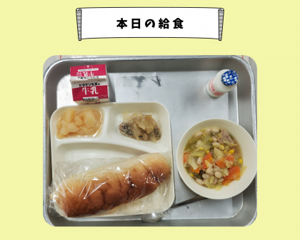 本日のメニューは、牛乳、パン、あじのレモンマリネ、てぼ豆のスープ煮、白桃、発酵乳でした。