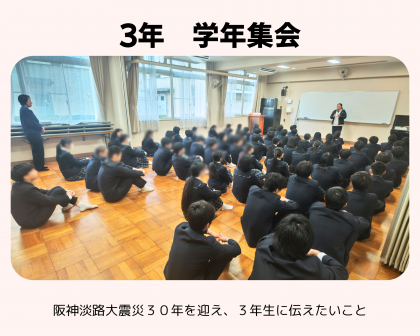 阪神淡路大震災からちょうど30年目を迎えたこの日、日頃からの防災意識の大切さのお話がありました。お話された学年の先生が学生だった時に体験した出来事をお話され、昨年1月に起こった能登の大震災について、復興まで10年はかかるといわれており、今度は今生徒である皆さんが、当時のことを後世に伝えていく番だとのことでした。