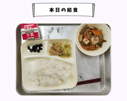 本日のメニューは、ごはん、牛乳、、筑前煮、ツナとキャベツのごまいため、黒豆の煮もの でした。