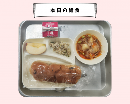 本日のメニューは、パン、牛乳、ケチャップ煮、ささみと野菜のソテー、りんごでした。