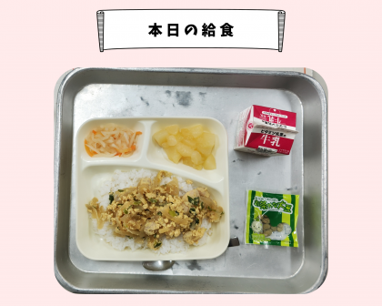 本日のメニューは、牛乳、親子丼、紅白なます、まっ茶大豆、洋なしでした。