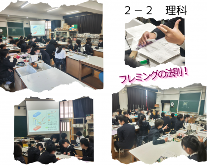 2年生の理科では、電流と磁石の働きによってどの向きに磁界が発生し、銅線がどのように動くのか、または動かないのか、以前に学習したフレミングの法則を使って予想して実験しています。