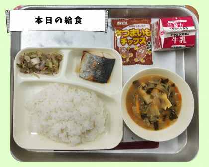 本日のメニューは、ごはん、牛乳、さごしのしょうゆだれかけ、みそ汁、キャベツの赤じそあえ、おさつチップスでした。