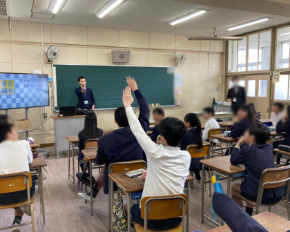 午後から九条南小学校にて出前授業を行いました。6年生の児童に体験してもらったのは、数学。トランプを使って、「正の数、負の数」を学習しました。児童からは、「あれ?わたし、数学わかるかも」との声が上がりました。