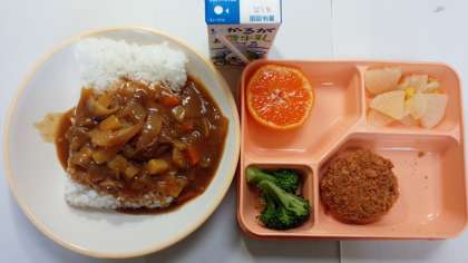 今日の給食はミンチカツカレーでした。
