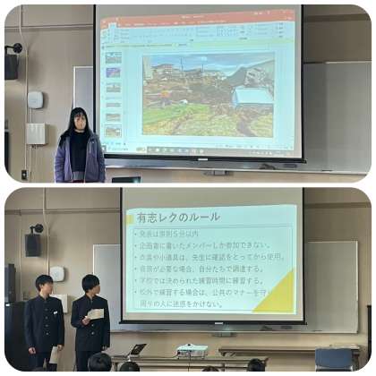 また、修学旅行のレクリエーション部より修学旅行での夜のレクリエーションに参加する有志の募集について説明がありました。