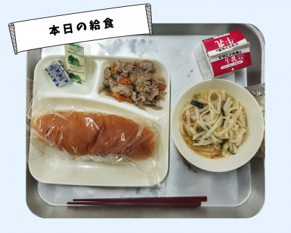 本日のメニューは、パン、牛乳、豚肉とごぼうの煮もの、なにわうどん、とろろこんぶ、固形チーズでした。