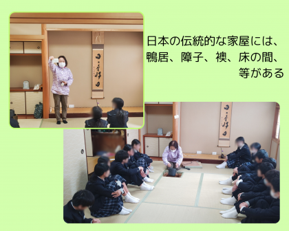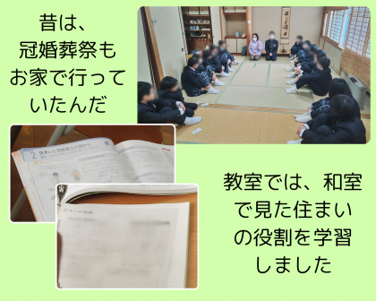 授業の前半で、中学校にある和室を訪れ、日本の伝統的な住まいについて学習しました。また、教室に戻ってからは住まいの役割をまとめました。その土地の気候や風土にあわせて快適に過ごせるように工夫されていることを知りました。