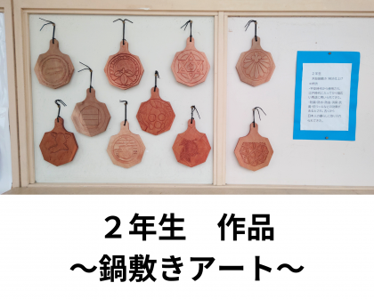 2年生が美術の授業で作った鍋敷きが廊下に展示されています。塗られた柿渋が木彫のデザインに深みを与えています。