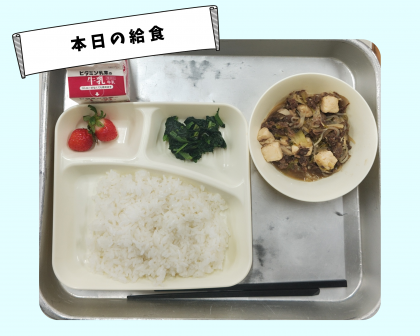 本日のメニューは、ごはん、牛乳、すき焼き煮、ほうれんそうのおひたし、いちごでした。