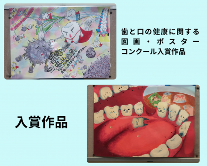 絵画写真コンクールに続き、歯と口の健康に関する図画ポスターコンクールの入賞作品が掲示されています。2点とも2年生徒による作品です。