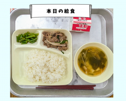 本日のメニューは、牛乳、ごはん、プルコギ、とうふとわかめのスープ、さんどまめのナムル でした。