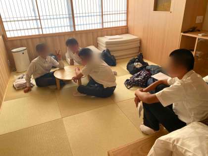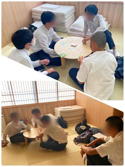 予定より早く着いたので、売店で土産を買う時間を先にとれました。写真は、現在1組がお風呂中で、部屋でくつろぐ2組男子の様子です。
