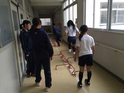 陸上部は廊下で低ハードルなどのトレーニングメニューに取り組みました。