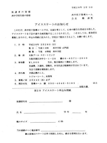 西中校下指導ルームの交流行事として、アイススケートを企画実施されます。