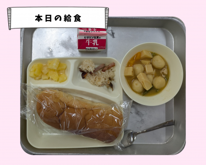 本日のメニューは、黒糖パン 牛乳 金時豆の中華おこわ まる天と野菜のうま煮 パインアップル でした。