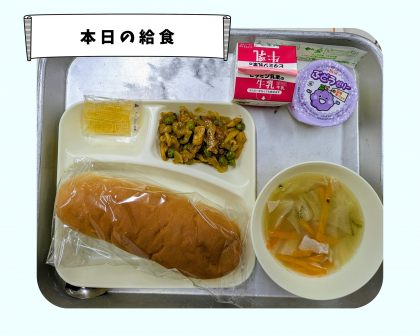本日のメニューは、コッペパン 牛乳 カレーマカロニグラタン てぼ豆のスープ ぶどうゼリー マーマレード でした。
