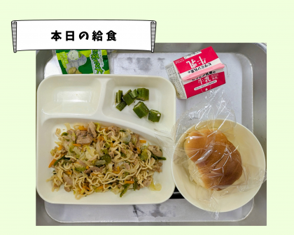 本日のメニューは、ミニコッペパン 牛乳 和風焼きそば きざみのり オクラのかつお梅風味 まっ茶大豆 発酵乳 でした。