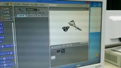 ゲームの操作を説明書なしで覚えていくように、子どもたちは次から次へとプログラミングの操作を楽しんでいました。講師の指導後は、それぞれの創造の世界(動くハエとそのハエをハエたたきで叩き落とす。)をプログラムしていました。