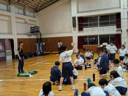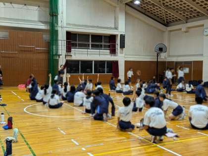夕食が早かったため、キャンプファイヤーの後は、体育館にて補食を取っています。疲れた表情の生徒も多かったのが、一気に元気に。