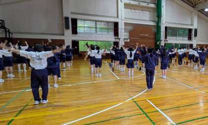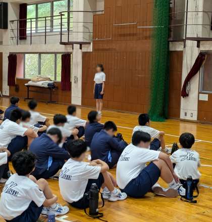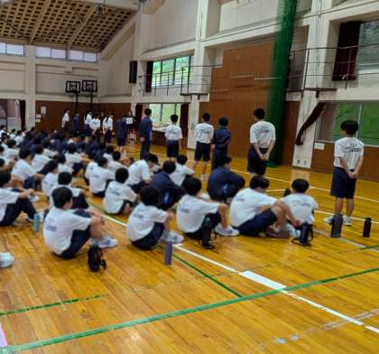 清掃活動後、雨がバラバラと降ってきたので、体育館にて朝の集いを行っています。この後、朝食をとって野外炊飯に行きます。