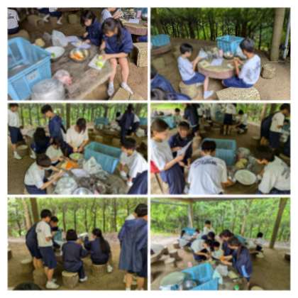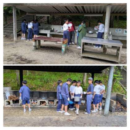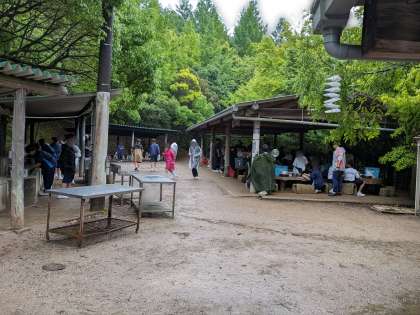雨も小降りになり、野外炊飯がスタートしました。切った野菜の香り、かまどの木の燃える匂いが立ち込めてきています。