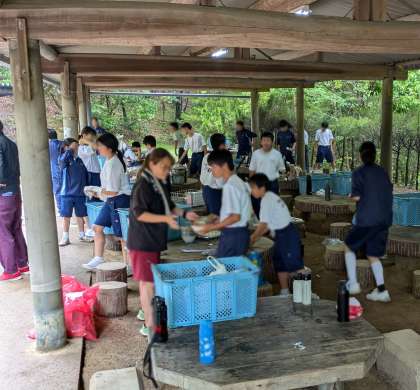 昼食を終えましたが、雨脚が強くなってきました。片付けでは雨で苦戦する場面も。学校には予定時間通り戻れそうですが、もし保護者の皆様でお迎えに来てくださる方は、子どもたちの傘をお持ちいただけると助かります。