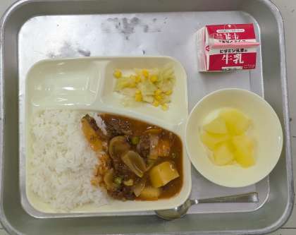 本日のメニューは、ごはん 牛乳 ハヤシライス キャベツとコーンのサラダ りんご(カット缶)でした。