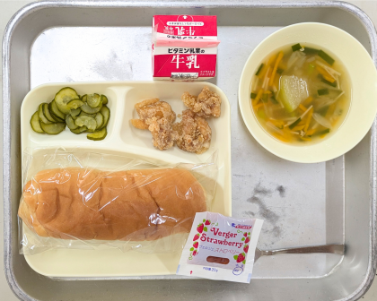 本日のメニューは、コッペパン 牛乳 鶏肉のからあげ ハムととうがんの中華スープ きゅうりのピリ辛あえ いちごジャム でした。