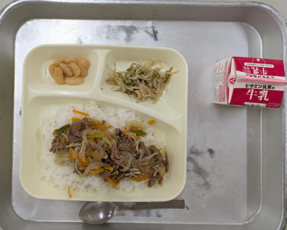 本日のメニューは、牛乳 牛丼 もやしとピーマンのごまいため 大福豆の煮ものでした。