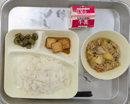 本日のメニューは、ごはん 牛乳 みそ肉じゃが あつあげのしょうがじょうゆかけ オクラのおかかいため でした。