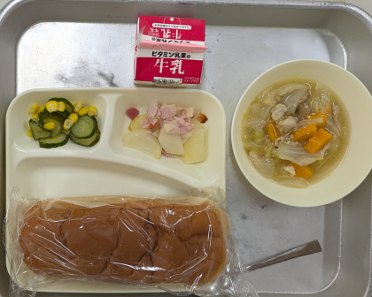 本日のメニューは、黒糖パン 牛乳 鶏肉と野菜のスープ煮 ジャーマンポテト きゅうりとコーンのサラダ でした。